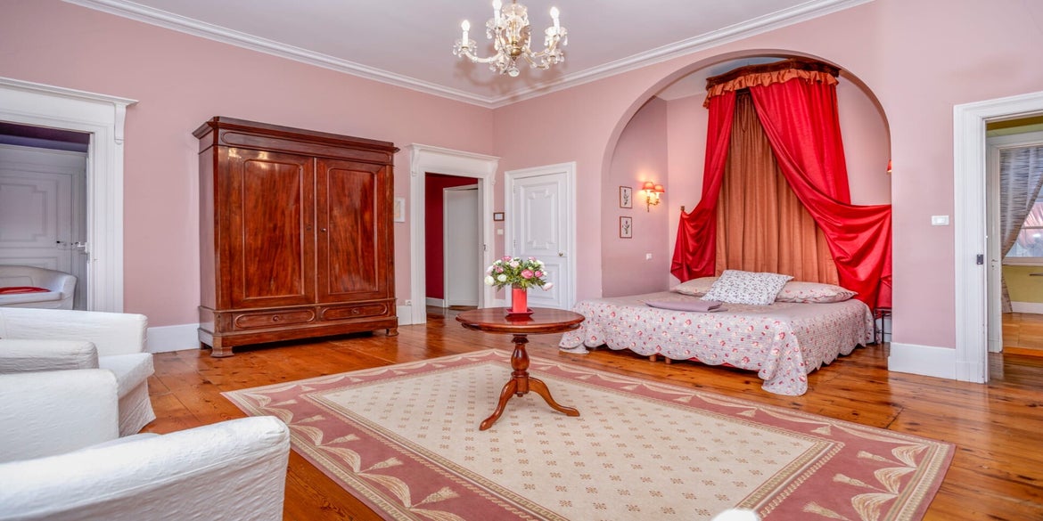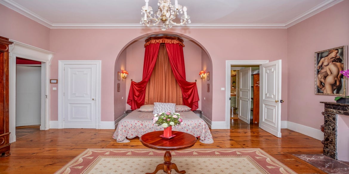 Cette jolie chambre charmante aux couleurs rouge est située au 2ème étage d'une superficie de 53m2. Vous apprécierez sa vue sur le parc et la chaîne des Pyrénées depuis le coin salon. Une très grande salle de bain est disponible avec baignoire et douche à l'italienne, 3 vasques sont disponibles pour un confort optimal et un coin toilette discret.