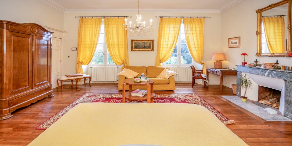 La double suite est située au 2ème étage, elle dispose d'une magnifique chambre aux couleurs jaunes avec une salle d'eau attenante privée, vous apprécierez le calme de cette chambre avec vue directe sur le parc et la chaîne des Pyrénées depuis le coin salon. Pour les groupes de 4 personnes, une chambre et salle d'eau complémentaires sont disponibles pour plus de confort (frais supplémentaires appliqués).